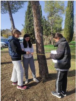- Salidas al patio en grupos para medir altura y circunferencia de tres árboles por grupo.
