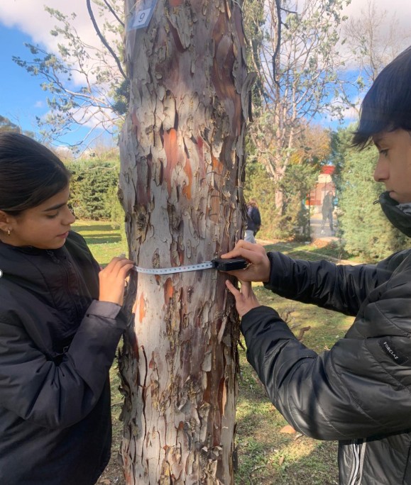 Los estudiantes han trabajado en equipo para medir y calcular la biomasa y el CO₂ almacenado en árboles del centro. Han realizado salidas al patio para tomar circunferencia y altura de los troncos, han aplicado fórmulas para estimar volumen y biomasa, y han convertido esa biomasa en toneladas de CO₂ secuestrado. Además, han usado una calculadora de huella de carbono familiar para comparar las emisiones generadas por cada hogar durante el curso.